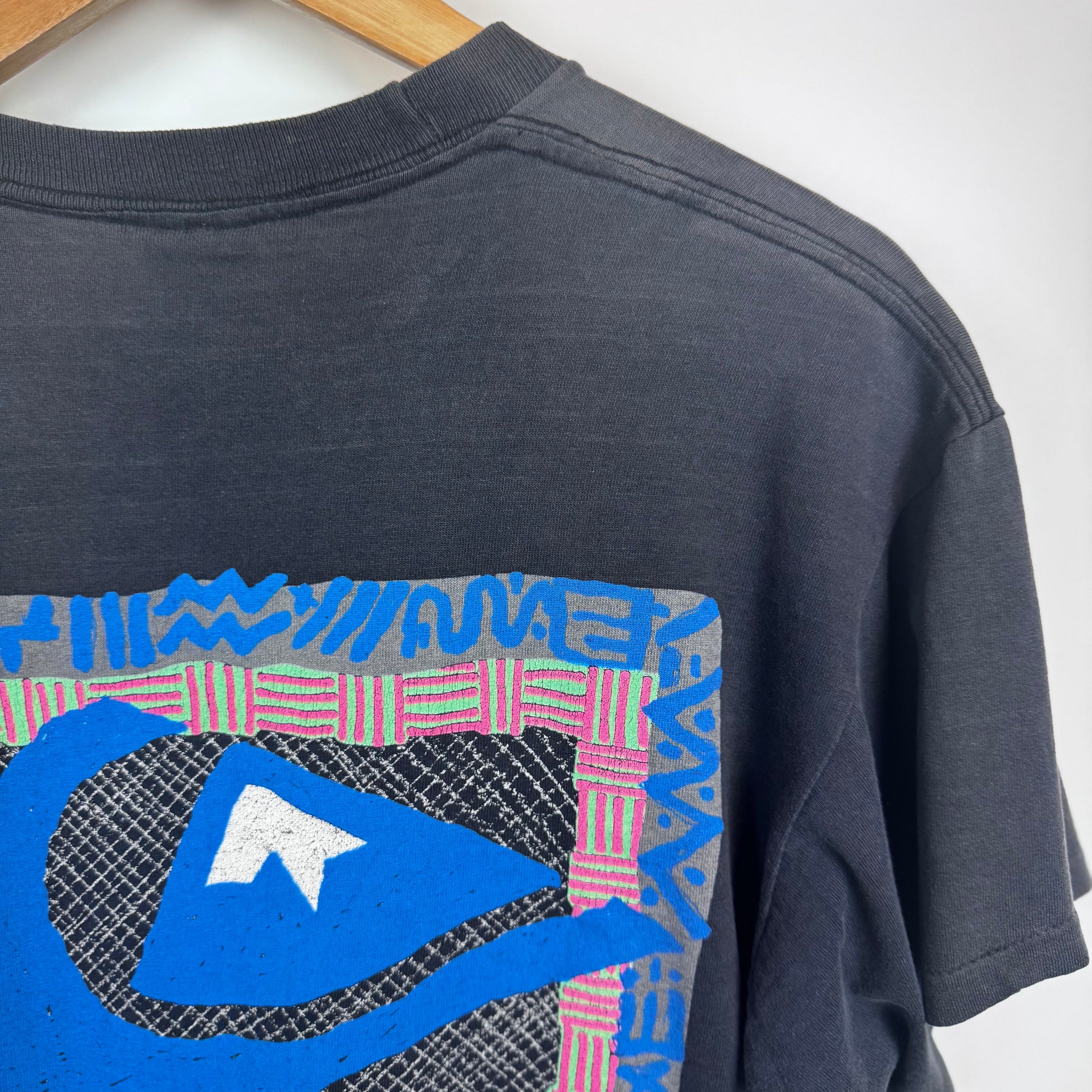 Details : Bring back the bold surf style with this vintage Quiksilver tee. Featuring a small chest logo print on the front and a large, vibrant graphic on the back, this shirt captures the classic 90s surf aesthetic. The design combines bright blues, pinks, and geometric patterns with the iconic Quiksilver logo, making it a standout piece for any collection.