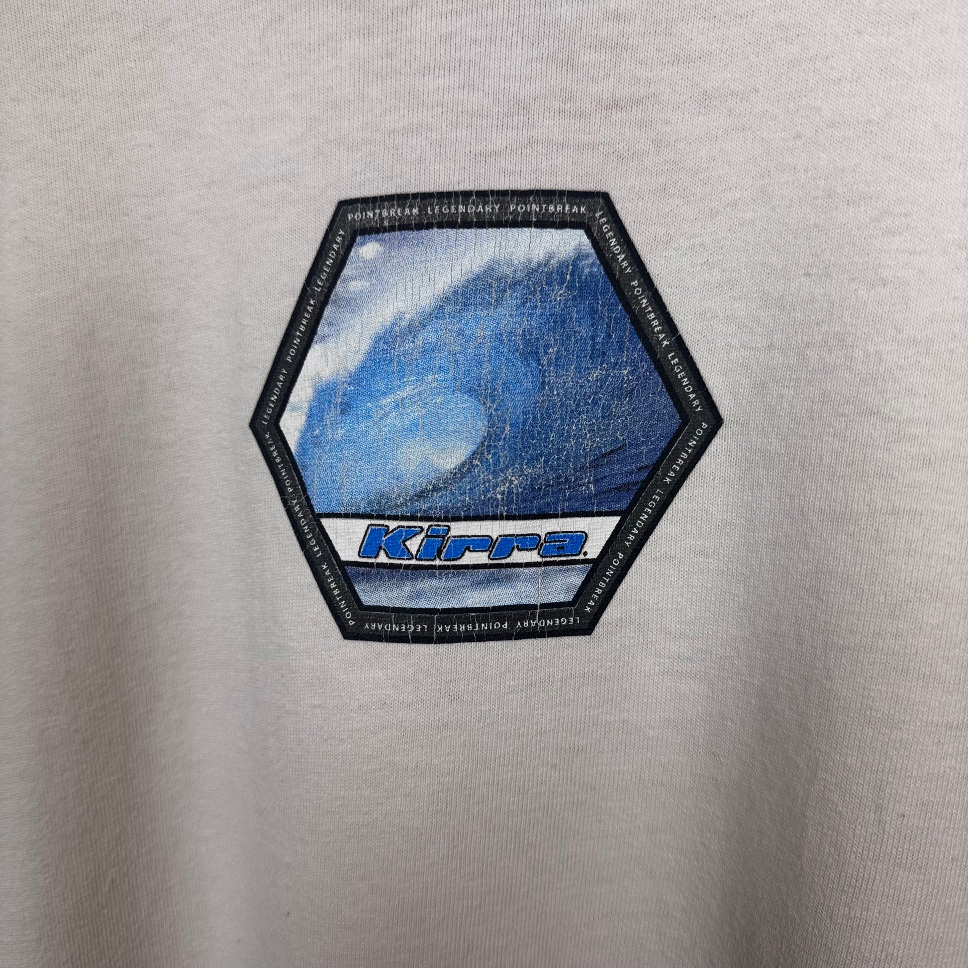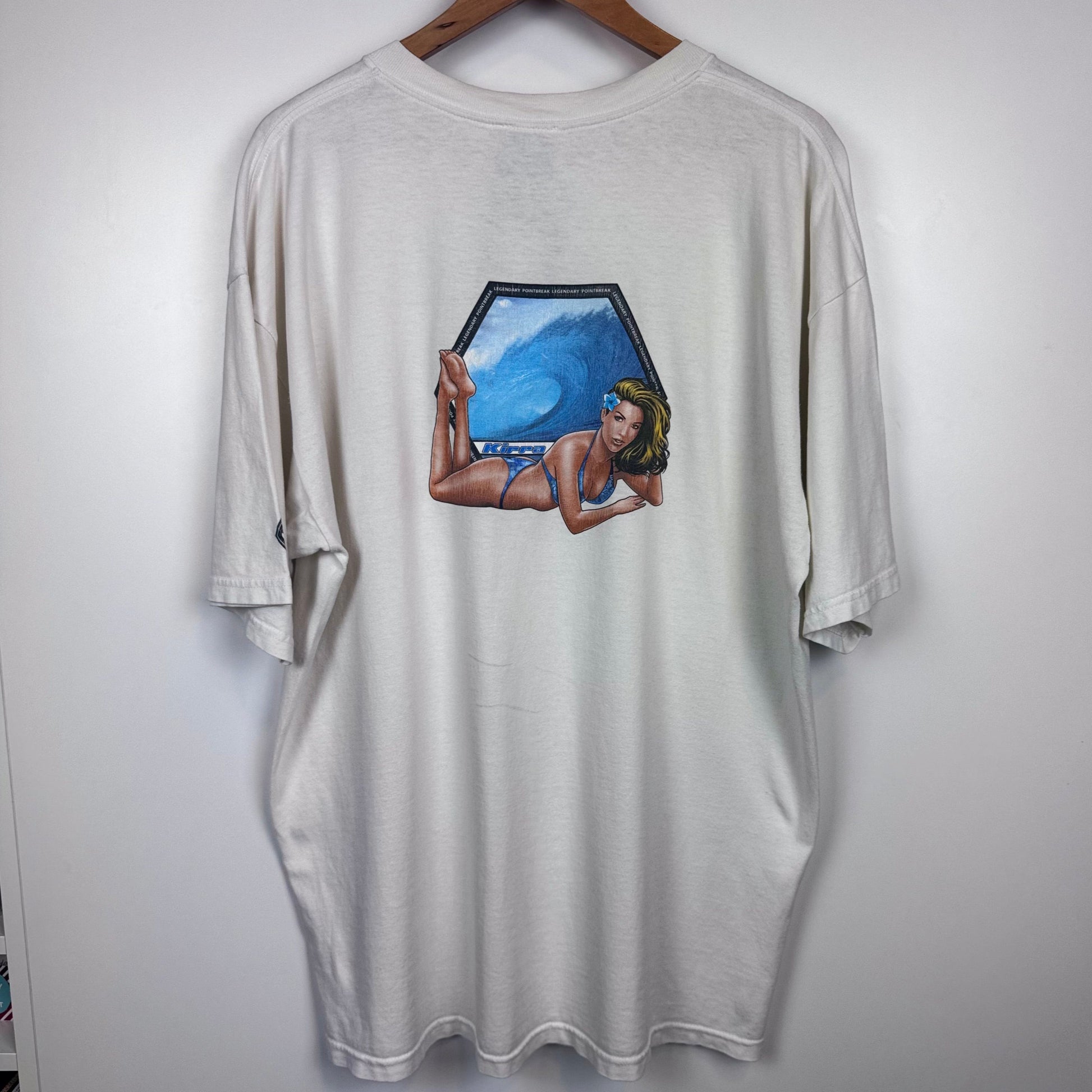 Details : Ride the wave in style with this vintage-inspired surf tee. Featuring a minimalist front chest graphic of an ocean wave inside a hexagon, and a bold back design with a retro pin-up girl lounging in front of a breaking wave, this shirt perfectly blends surf culture with classic 90s streetwear vibes.