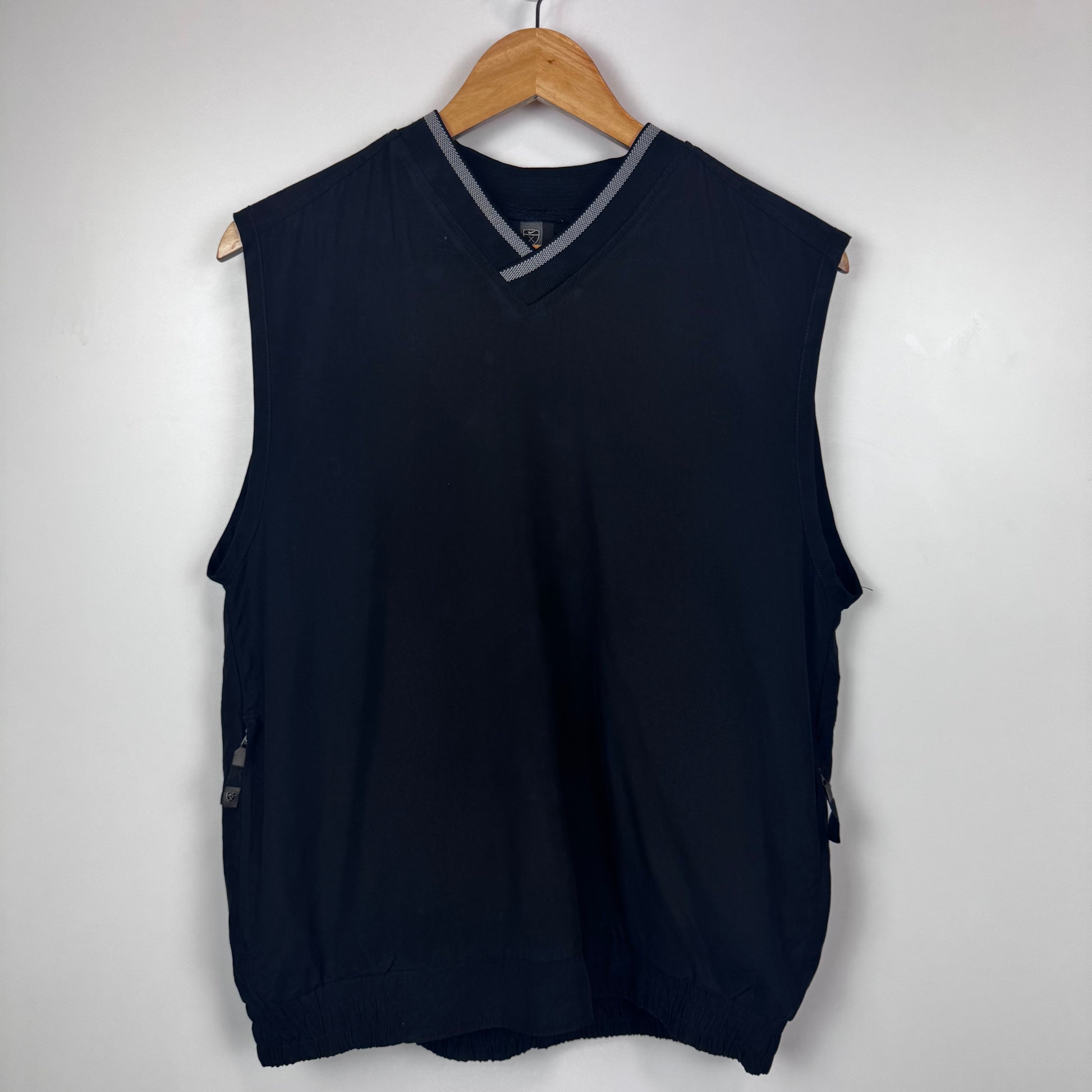 Details : Stay stylish on and off the course with this classic black golf vest. Lightweight and breathable, this sleeveless pullover is perfect for layering over polos or tees. Features a V-neck with subtle grey trim and zippered side pockets for secure storage. Elasticated hem for a snug fit. Great for golf, casual wear, or streetwear vibes.