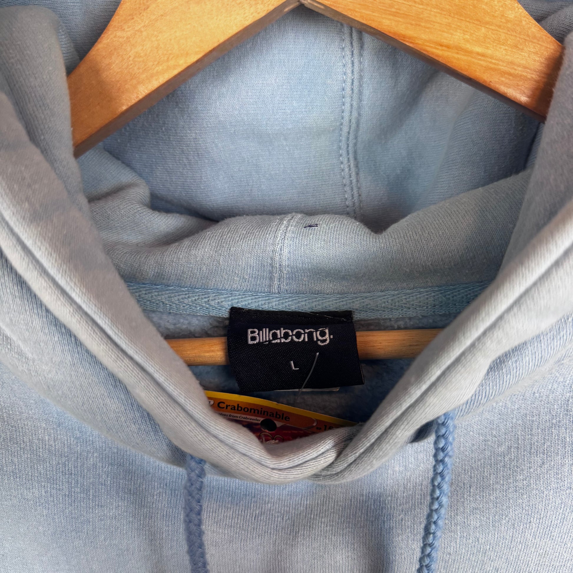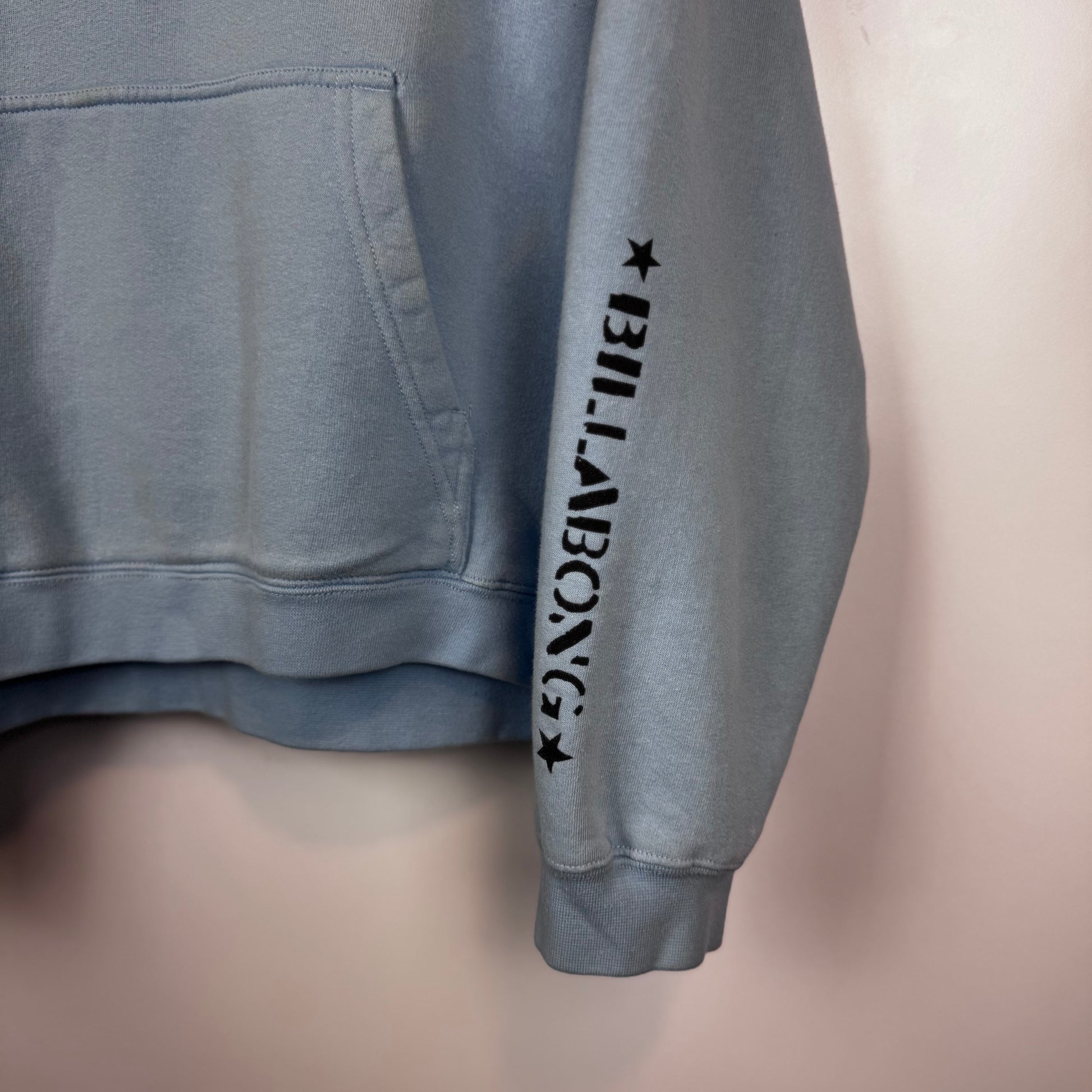 Details : Add a coastal vibe to your wardrobe with this vintage Billabong hoodie. Designed in a soft light blue with bold black logo prints on both sleeves and a golden wave chest graphic, this hoodie delivers laid-back surf style with classic comfort. The pullover fit, kangaroo pocket, and drawstring hood make it perfect for everyday wear.